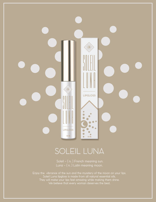 Soleil Luna is a mock brand lip gloss product created for Designed.co. The concept of the mock brand is a luxury lip gloss with an audience of women ages 18-40. The creative concept behind Soleil Luna is to create a lip gloss that is both the sun and the moon. Soleil. means "sun" in French and Luna means "moon" in Latin. The champagne gold color symbolizes the sun and the white silver color symbolizes the moon. The simple design is created in an abstract style with a sophisticated look and playful appeal. The sun is made up of circles and the moon is the crescent form of a circle. I designed the brand logo, the package design along with a print advertisement.